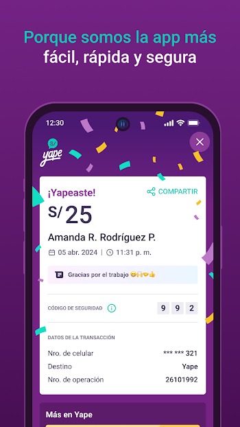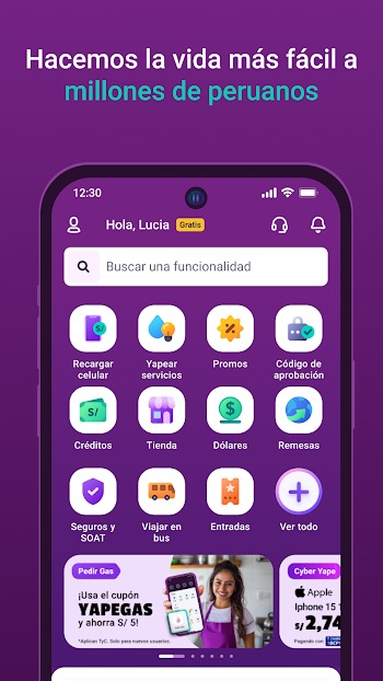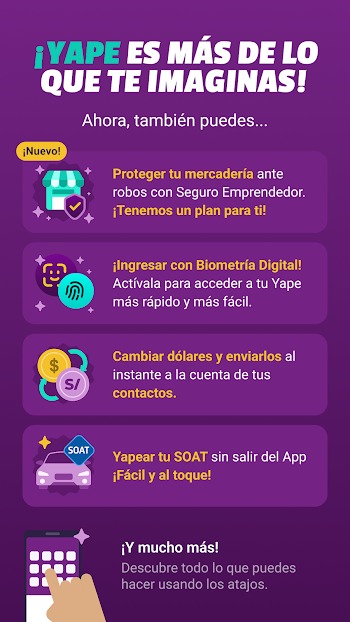 Yape es una app financiera gratuita que te permite enviar, recibir y pagar dinero al instante desde tu celular, recargar servicios y acceder a créditos y promociones en todo el Perú.